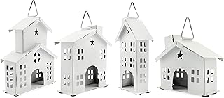 AuldHome Rustic White Tin Ornaments (Set of 4 Houses, White); Vintage Style Metal Christmas Tree Decorations